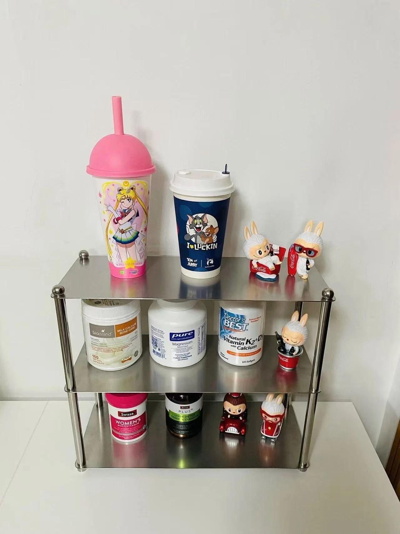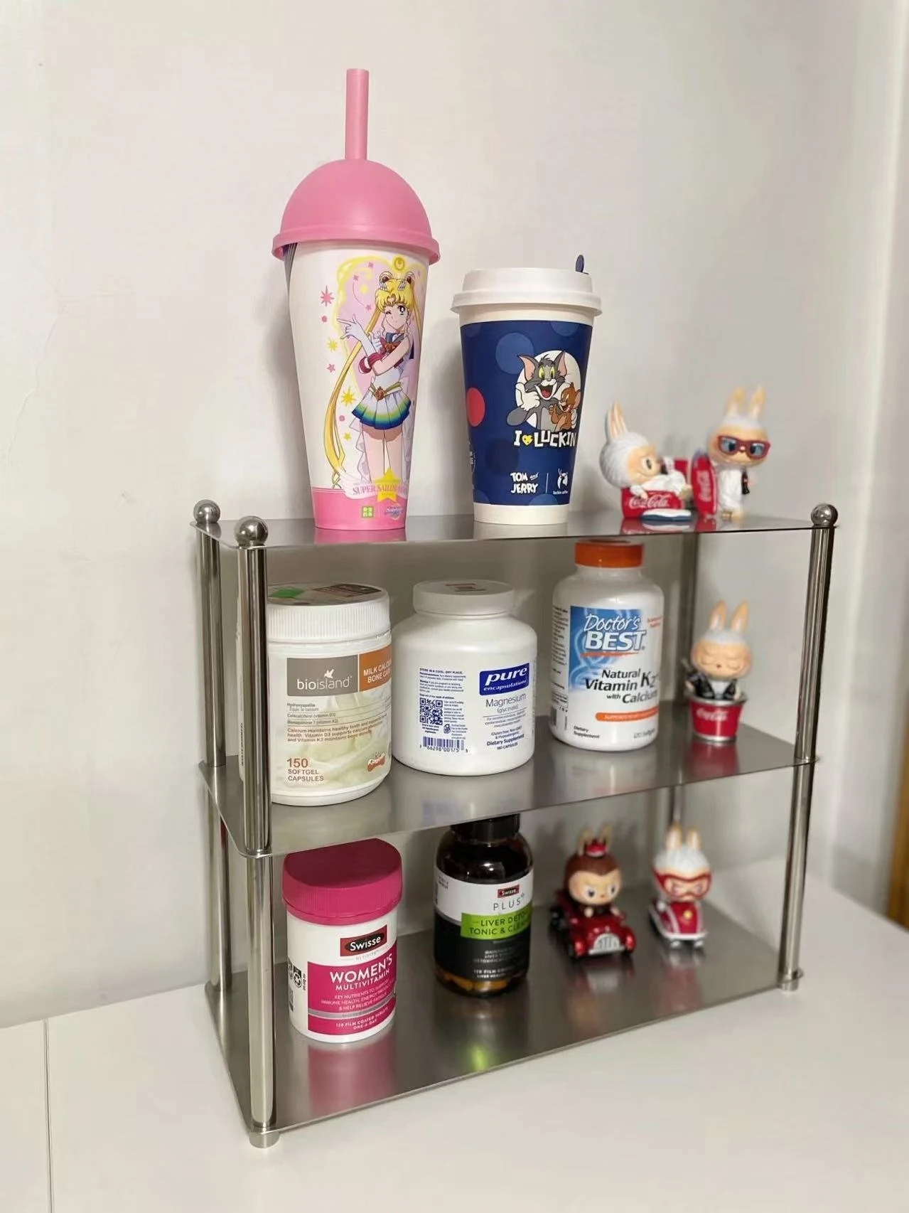 The layered layout keeps items organized without cluttering surfaces. It works as a coffee cup organizer or daily storage rack. Everything stays visible and easy to access.