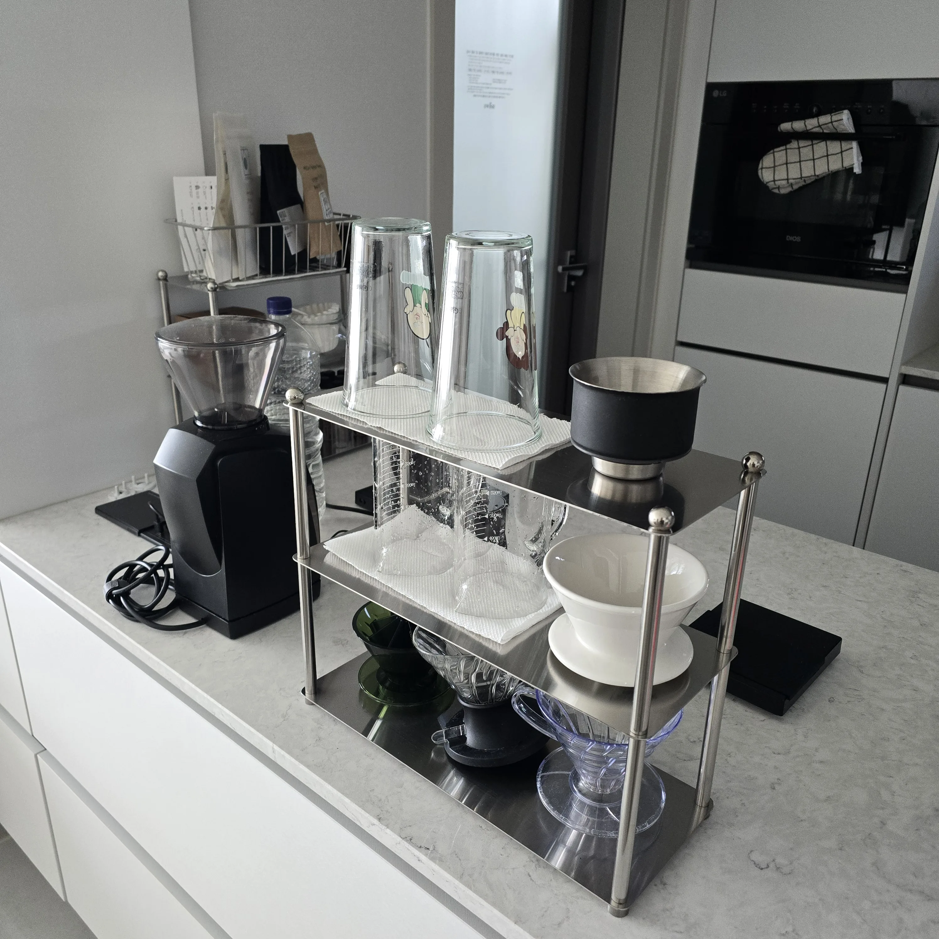 Ideal for organizing mugs and daily kitchen items. The stainless steel rack keeps everything visible. It supports clean countertop setups.
