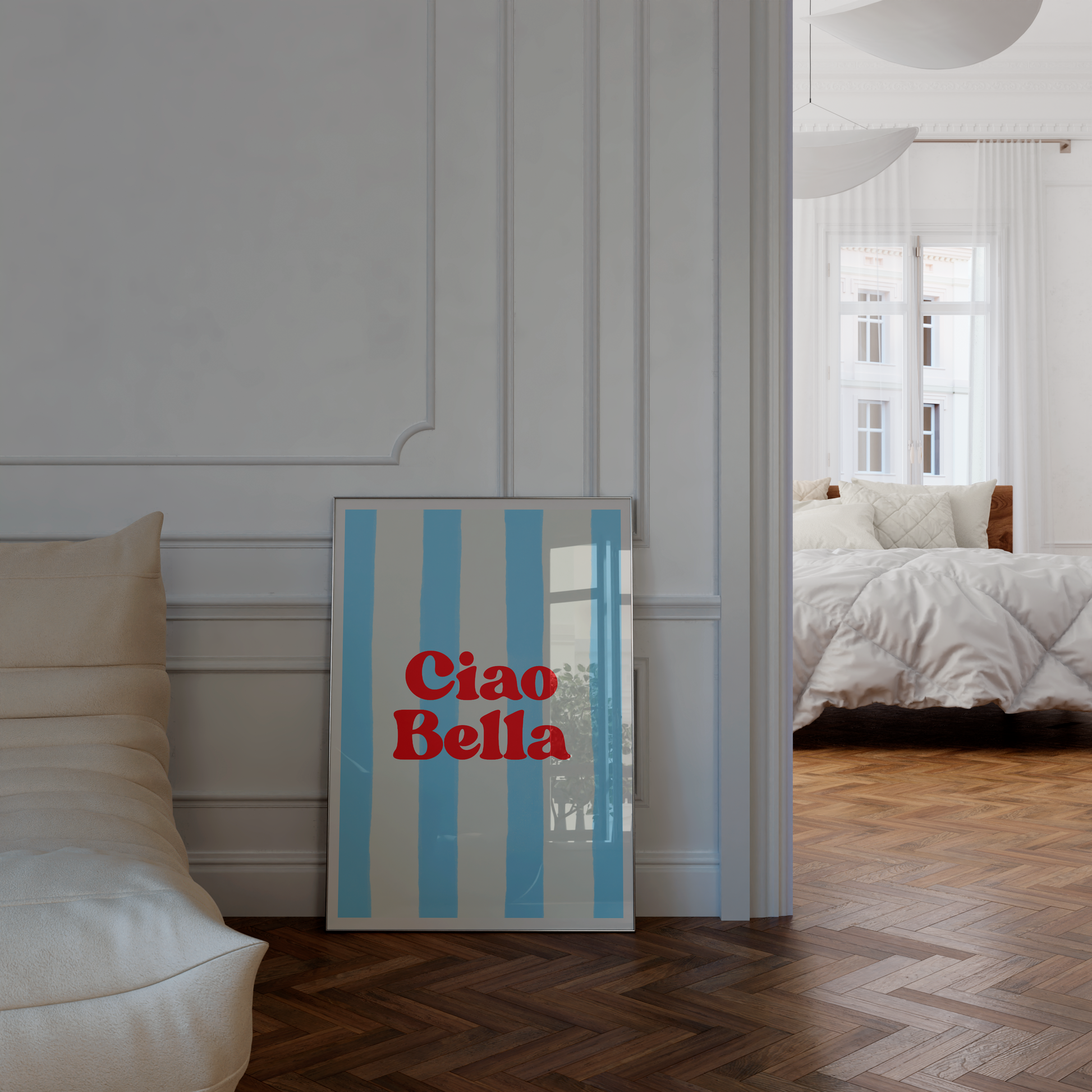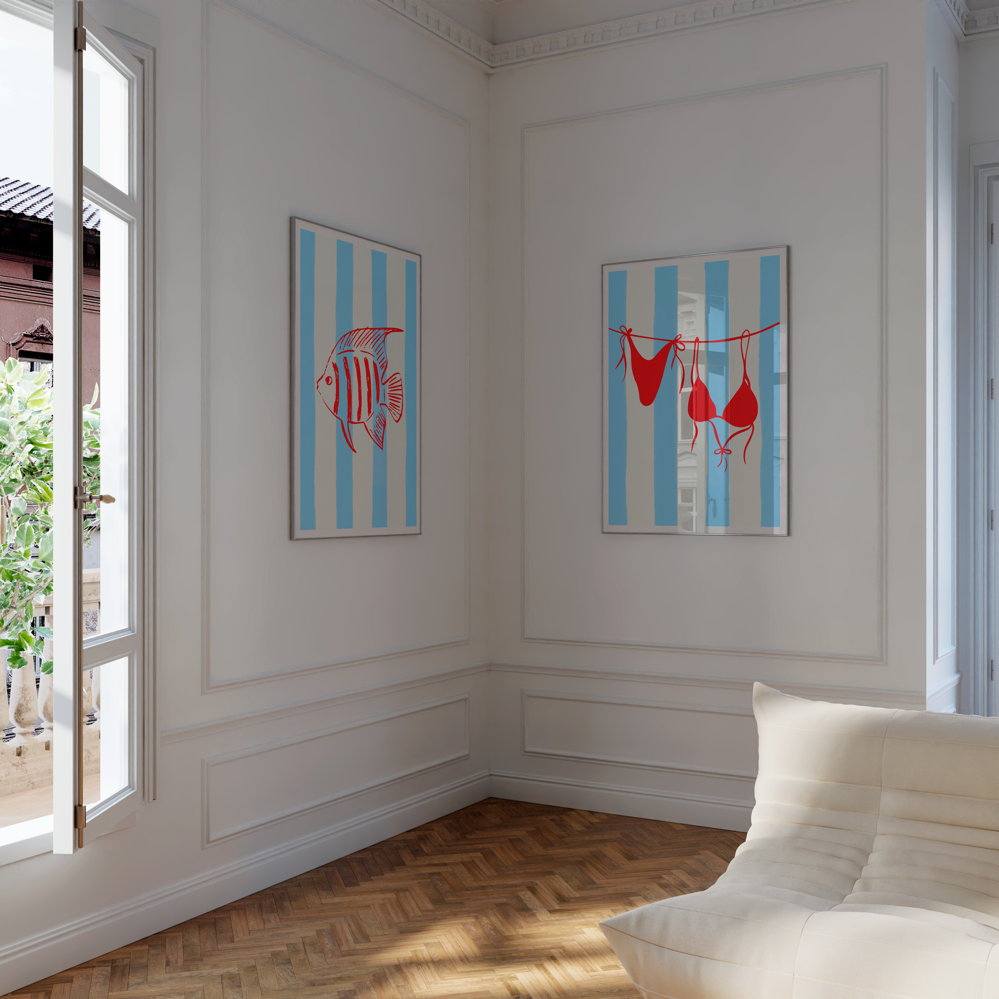 Bring the spirit of Italian summers into your space with this vibrant 3-piece digital poster set featuring blue stripes, a bold Ciao Bella quote, a whimsical red bikini, and a striped fish illustration. Perfect for coastal dopamine decor lovers, this set instantly adds a playful, preppy seaside vibe to your bedroom, dorm, or living room.