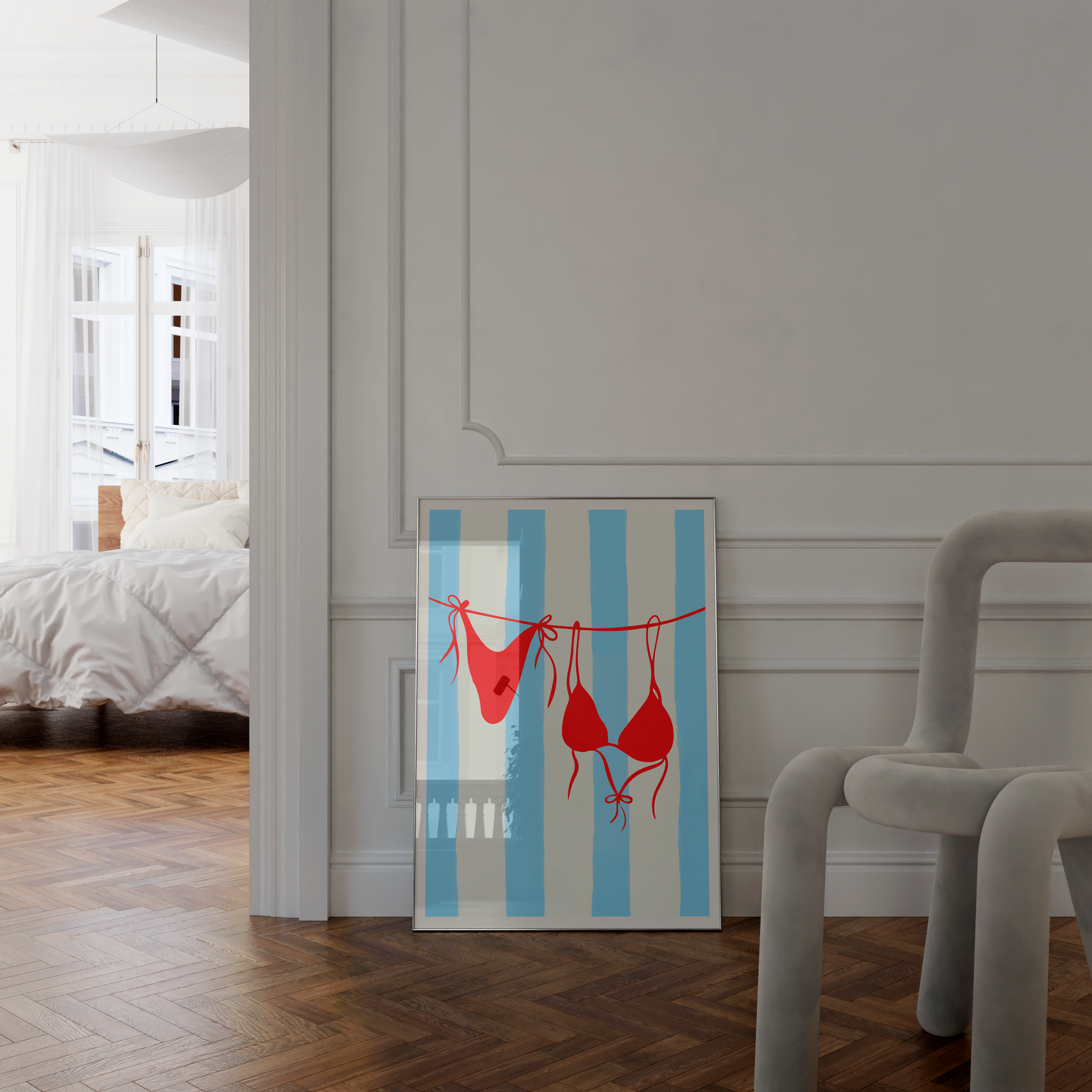 ✨ This poster set captures the carefree energy of summer in Italy — playful, romantic, and coastal. From the striped red bikini on a clothesline to the iconic “Ciao Bella” lettering, every piece brings visual joy and dopamine decor magic to your wall.