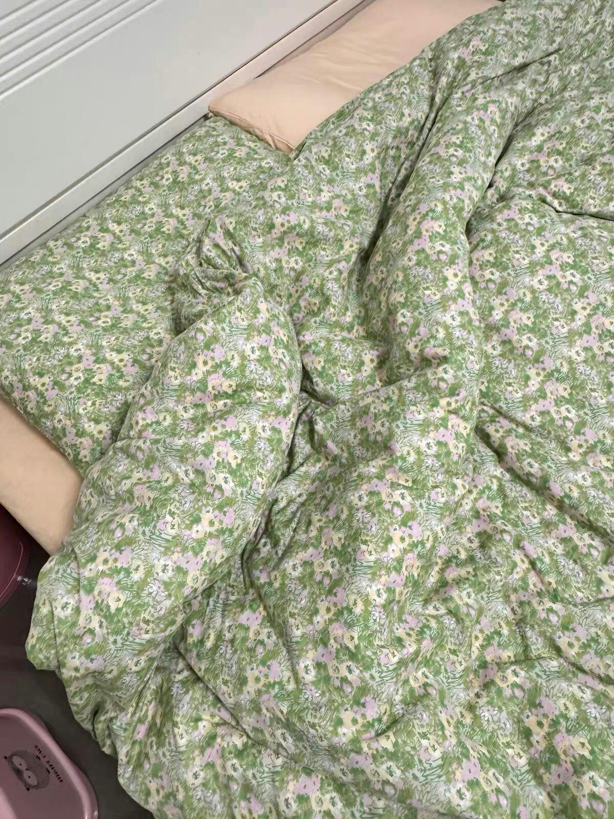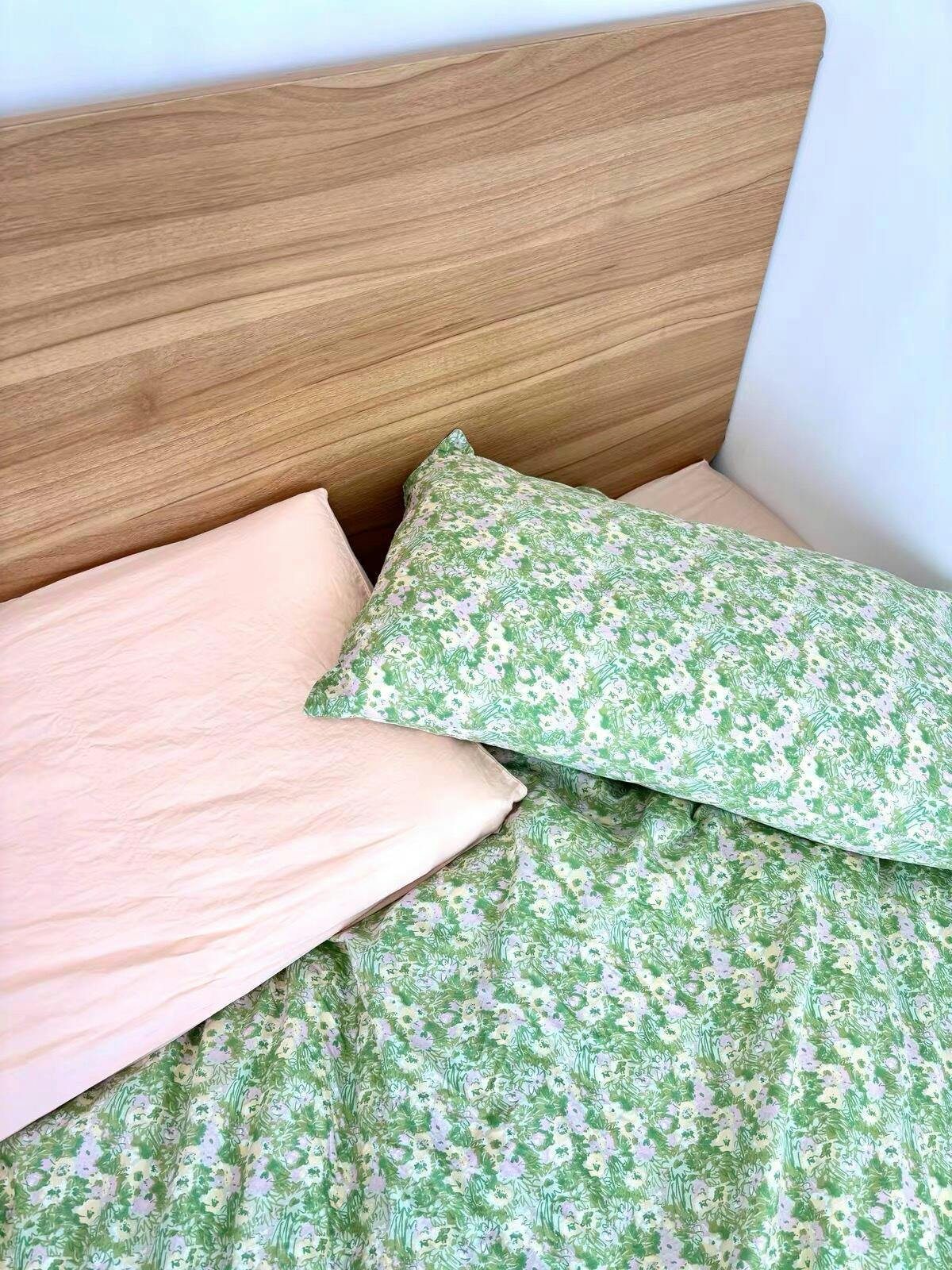 Bring a calm spring-garden feel to your bedroom with this green ditsy floral cotton bedding set. The small floral print looks soft and airy, perfect for a cottage-inspired or Korean minimalist space. Made from 100% cotton twill, it feels breathable and comfortable for everyday sleep in warmer seasons and layered months.