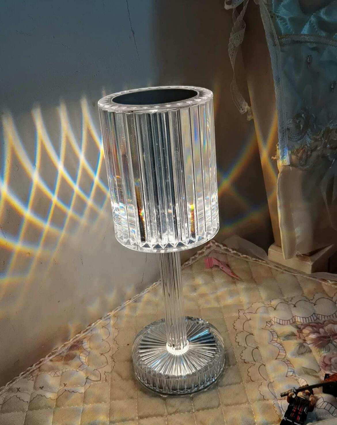 Illuminate your space with elegance using the LED Crystal Table Lamp. This USB rechargeable lamp is designed with a touch sensor and color-changing RGB light, making it perfect for creating a cozy ambiance at home, in bars, restaurants, or even as a unique bedside night light. The crystal-like design refracts light beautifully, adding a touch of romance and charm to any setting. This cordless, portable lamp is easy to move, offering up to 12 hours of light on a single charge, with options to control brightness and colors via remote or touch.
