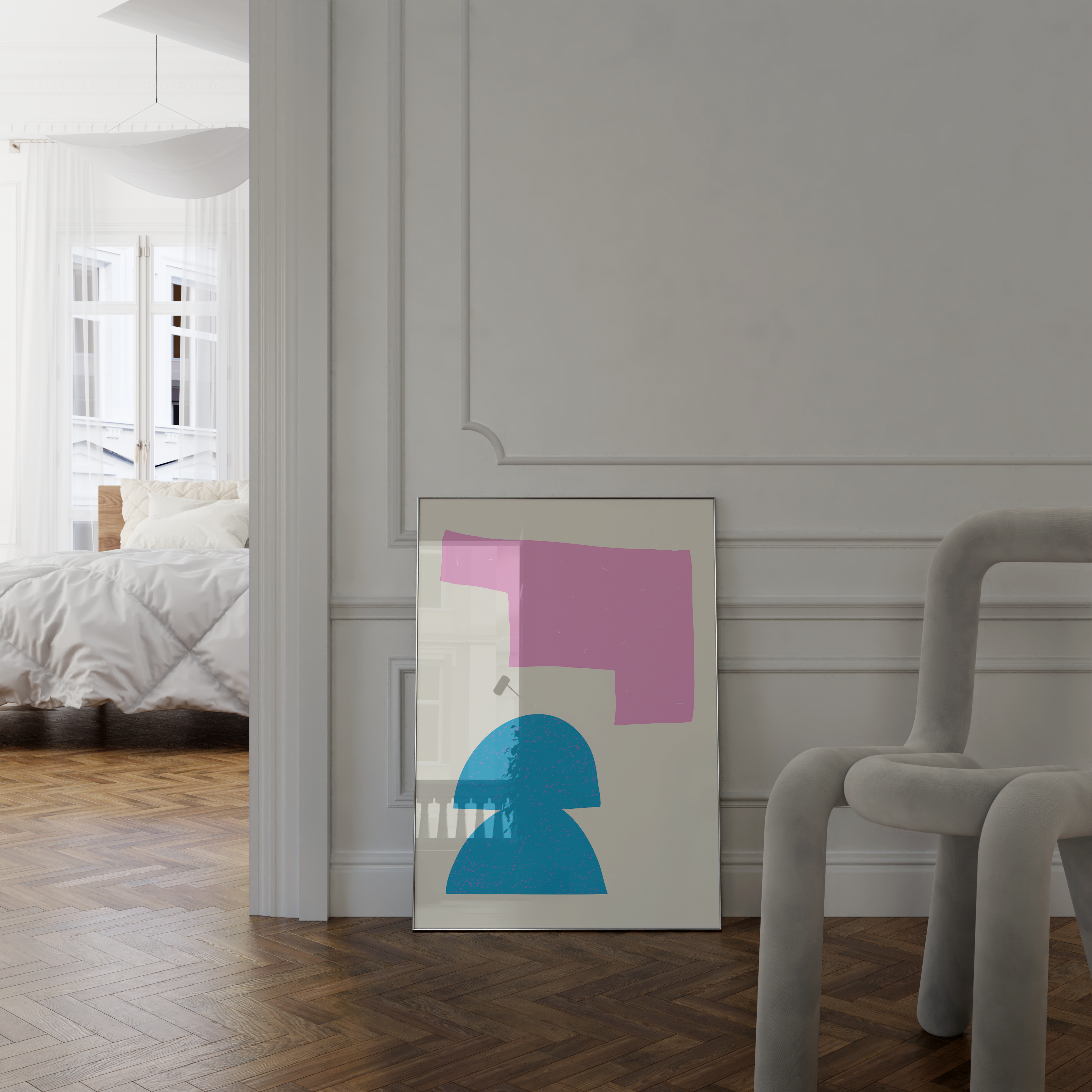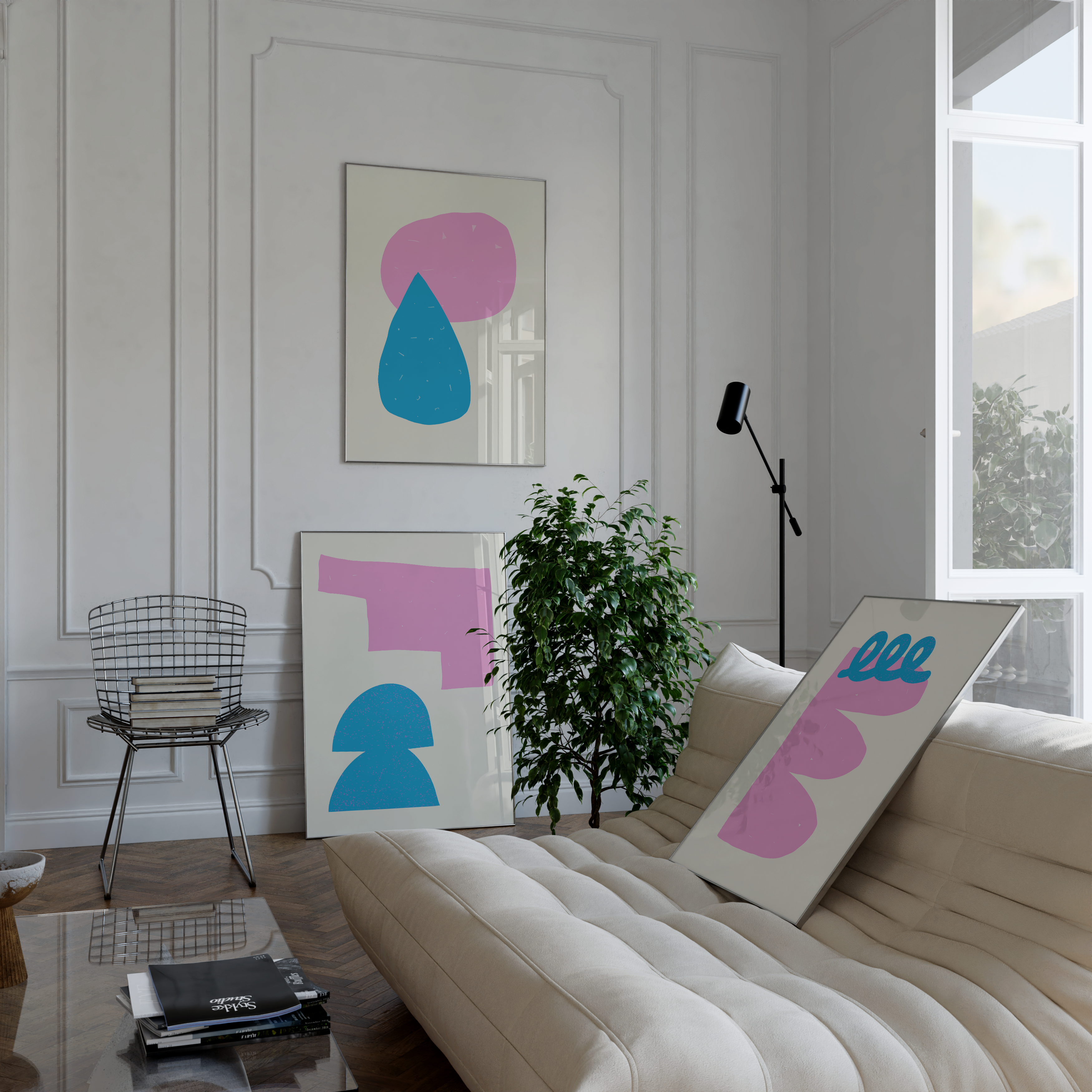 Transform your space with this minimalist abstract wall art set, featuring bold pink and blue geometric shapes. Designed for modern interiors, this 3-piece digital download brings a pop of color and dopamine energy to any room, from aesthetic dorms to creative studios.