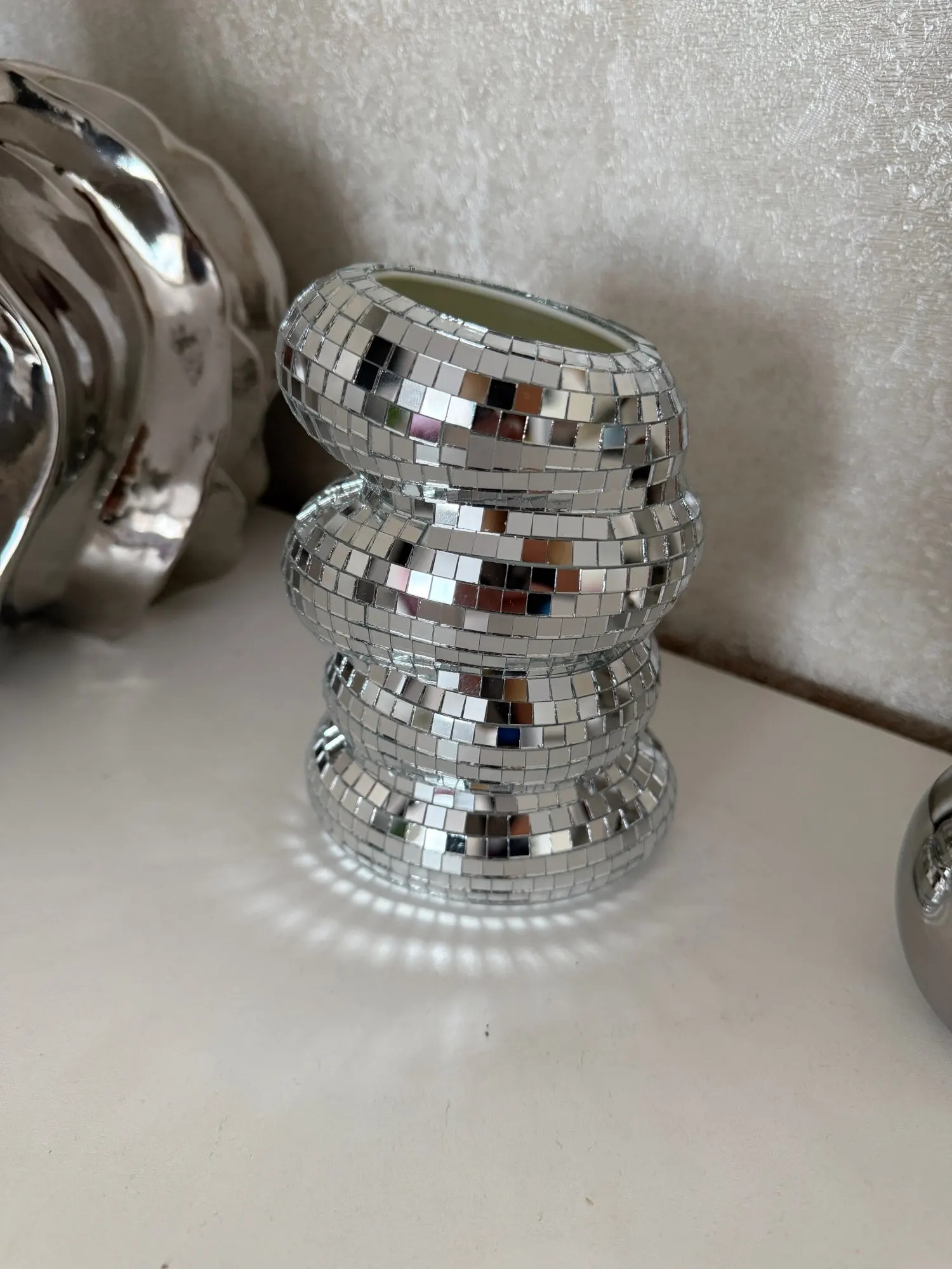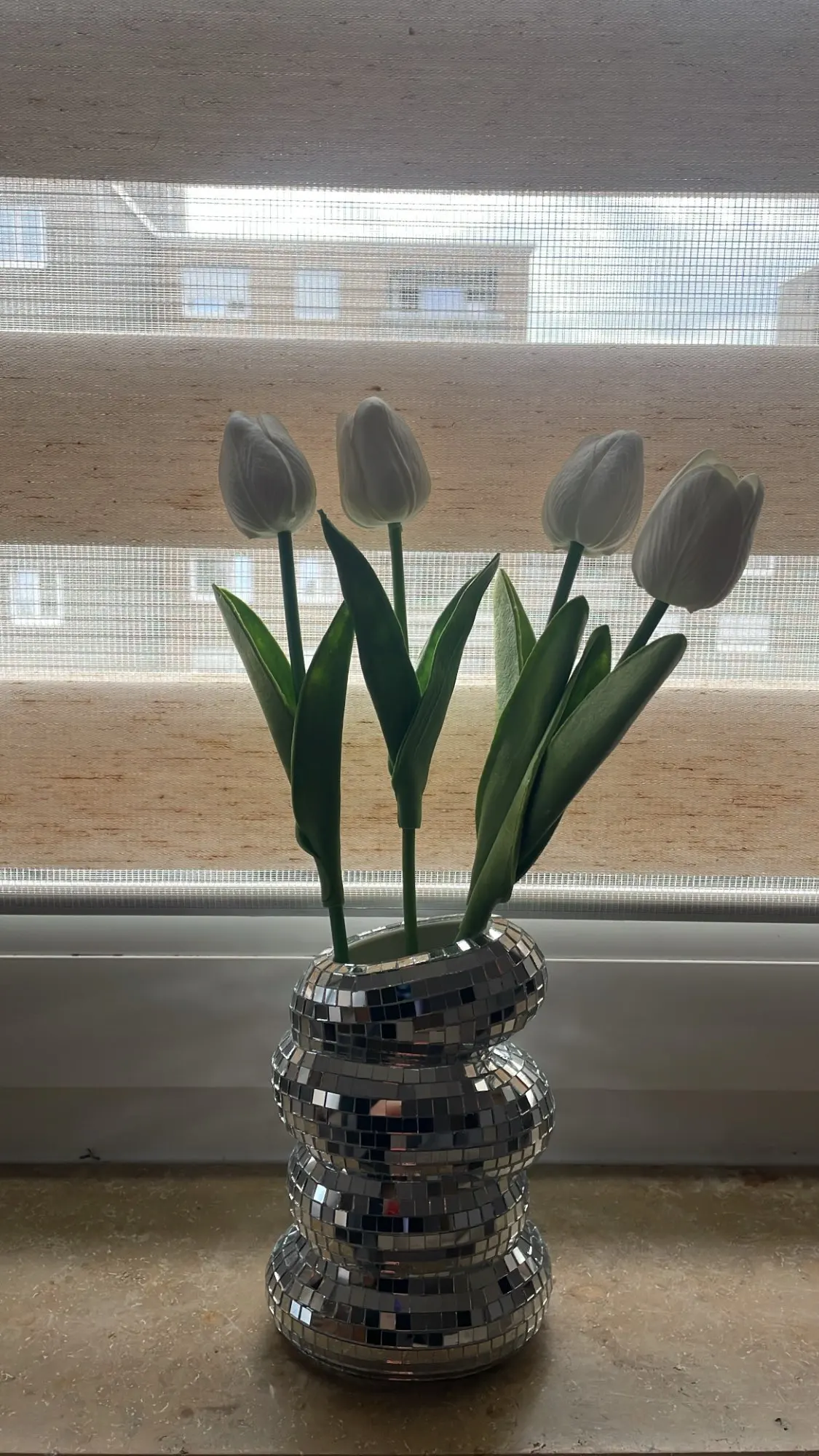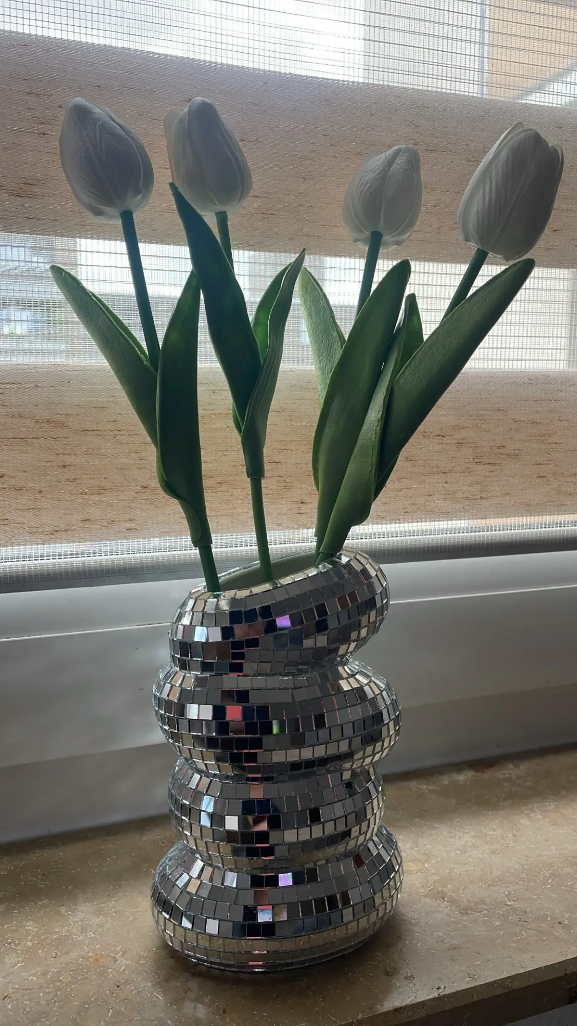 Two silver mosaic vases with floral arrangements on decorative columns against a light background